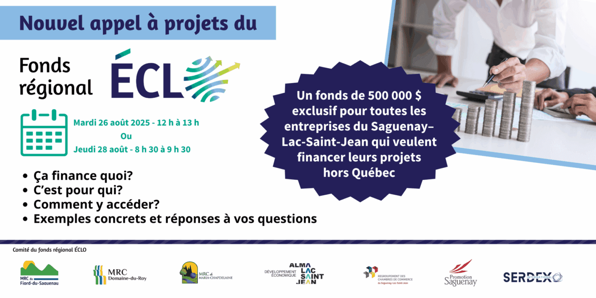 Vous êtes invités à notre séance d’information en ligne pour en apprendre davantage sur le Fonds ÉCLO! Rejoignez-nous pour découvrir les trois volets offerts du Fonds ÉCLO. C’est une excellente occasion de poser vos questions et de mieux comprendre ce fond offert pour vous.
